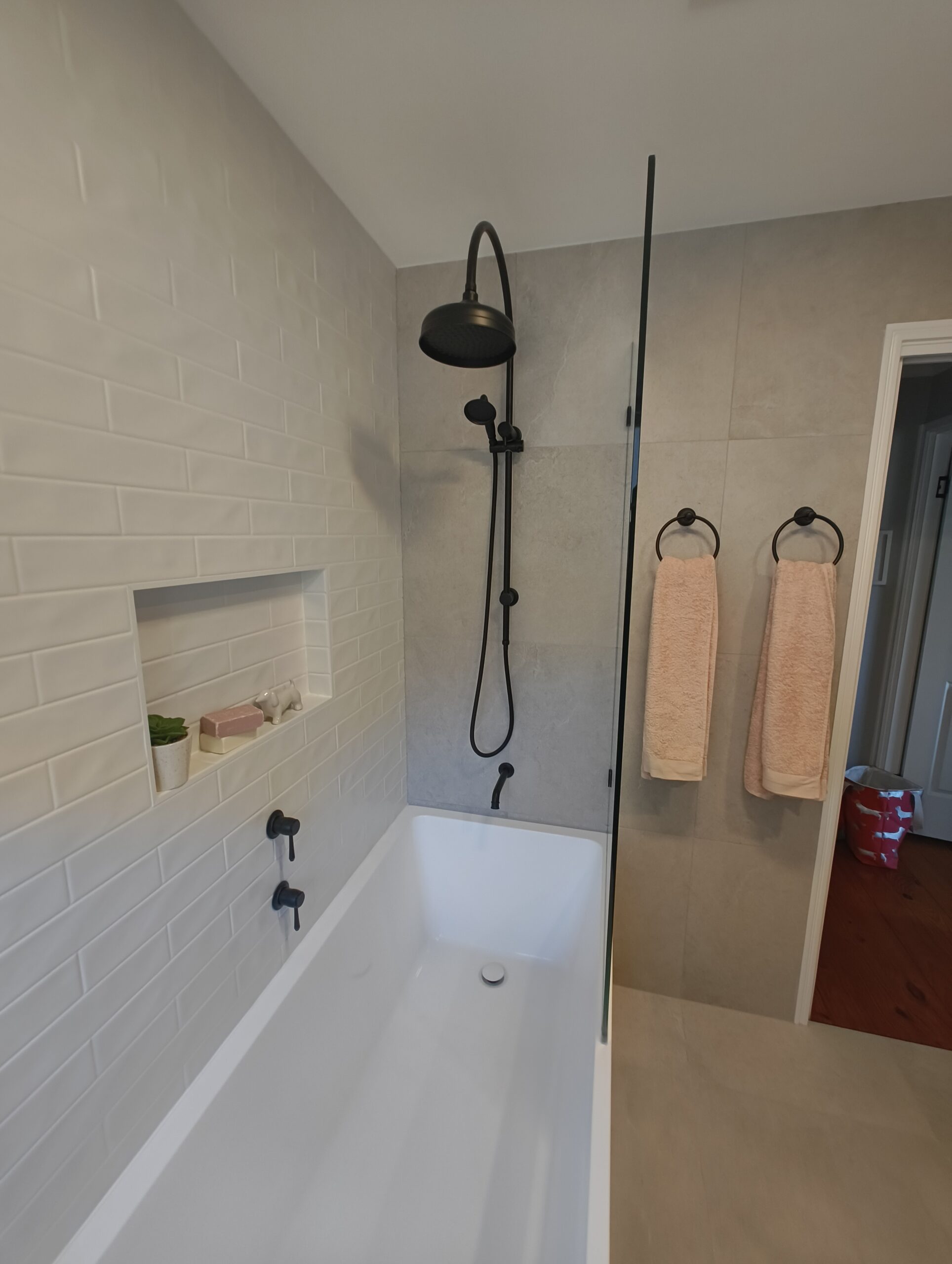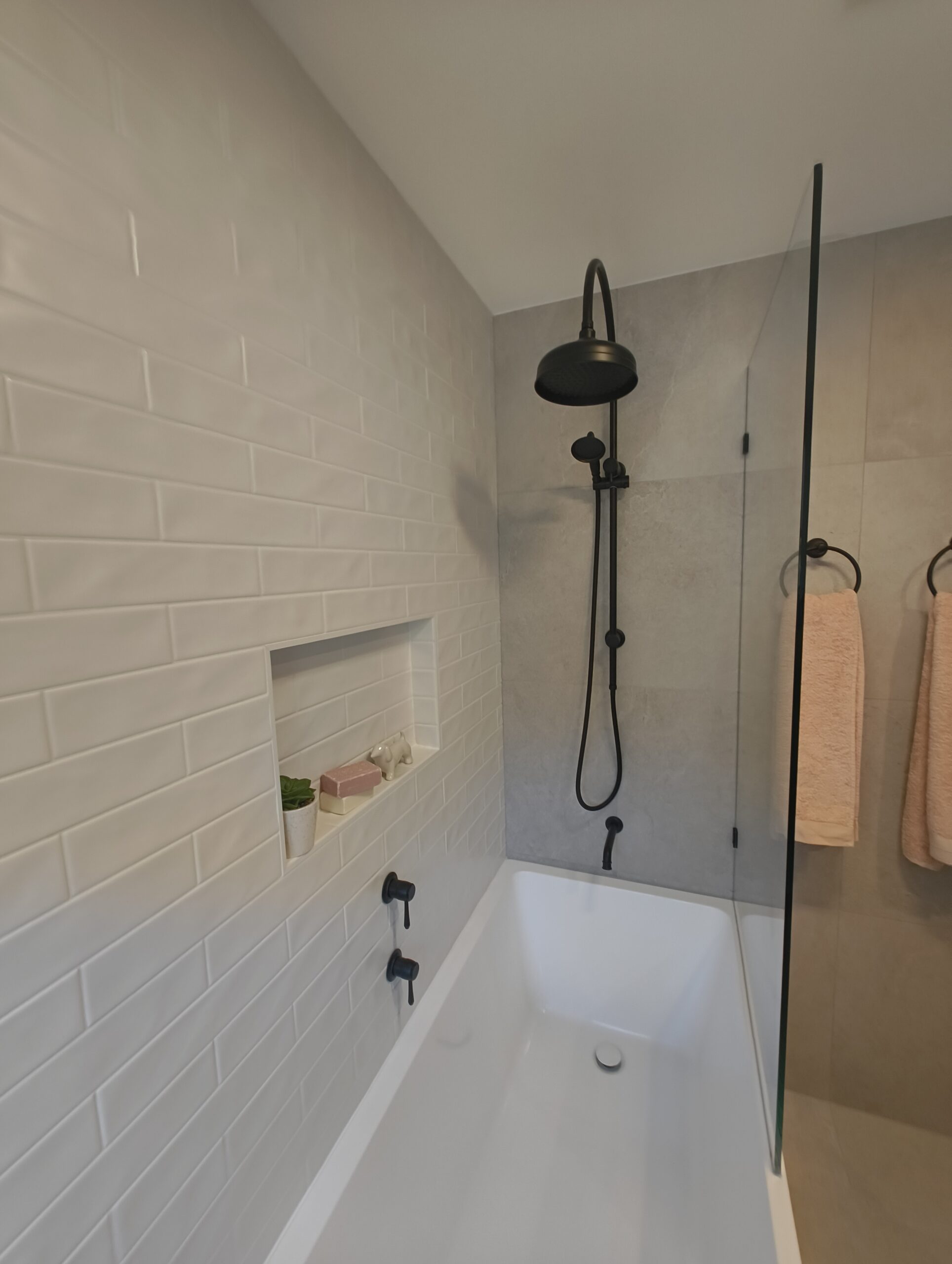 The new shower over bath installation features a beautifully practical wall niche for storing toiletries and essentials. A matching tallboy in a rich Florentine Walnut finish sits snugly in the corner, providing essential storage for towels and bathroom items—a game-changer for keeping clutter at bay.