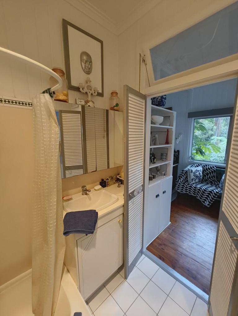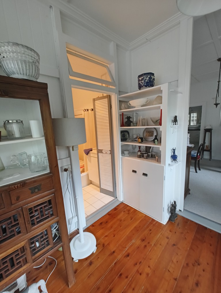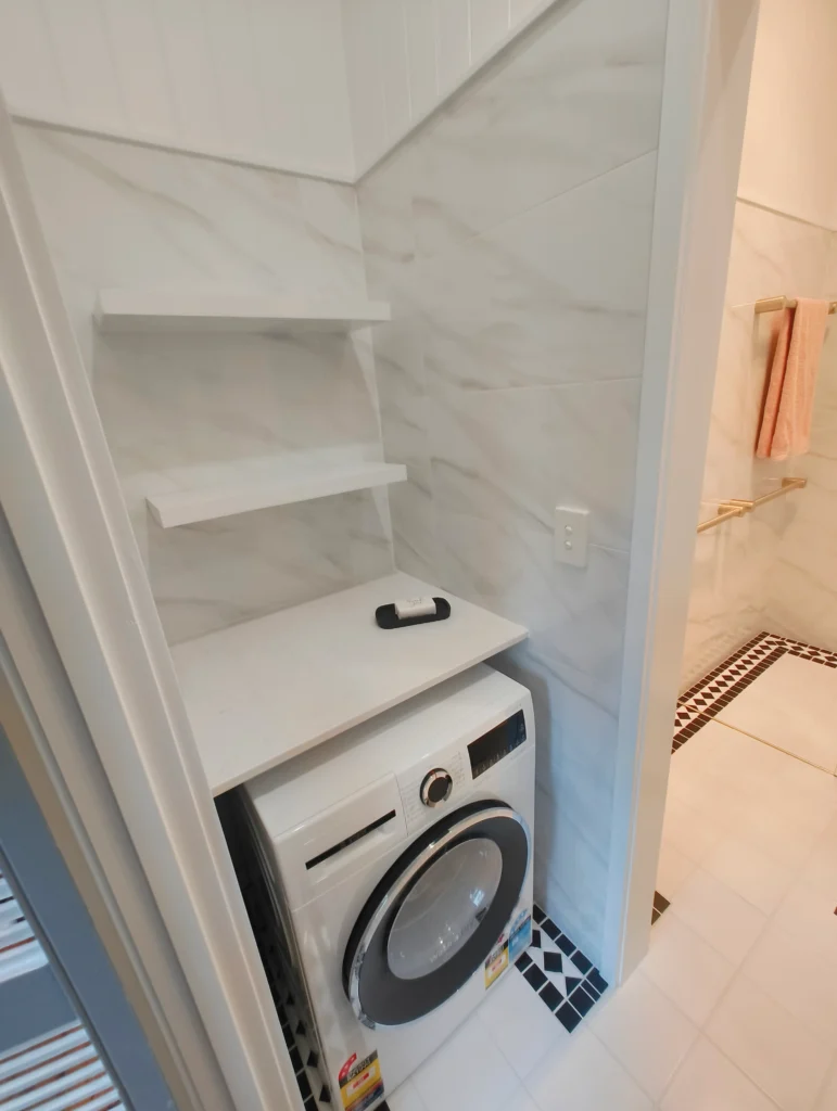 A compact laundry area was thoughtfully designed to accommodate the washing machine alongside floating shelving for storage of laundry essentials. The original double timber louvre French doors were relocated to enclose the laundry entrance, maintaining the home’s authentic character whilst creating a functional separation between spaces. An open doorway connects the bathroom and laundry areas for seamless flow.