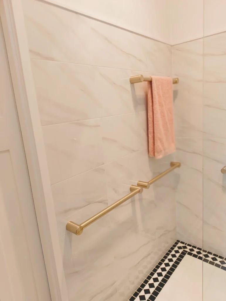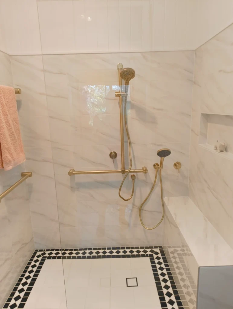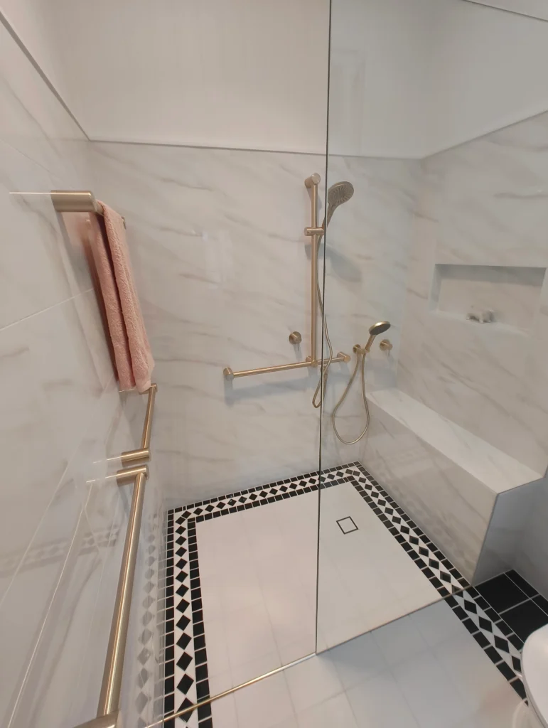 Brushed gold tapware, grab rails, and shower systems add an opulent touch that elevates the space beyond purely functional renovation. The warm metallic finish creates a luxurious feel whilst maintaining the classic aesthetic.