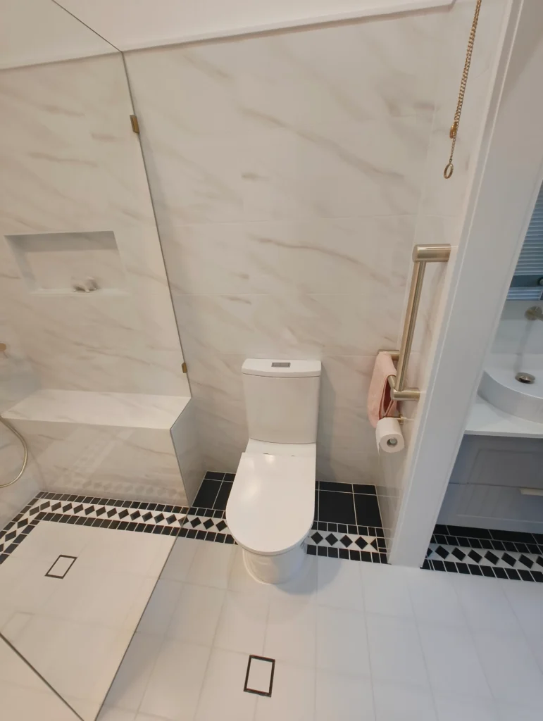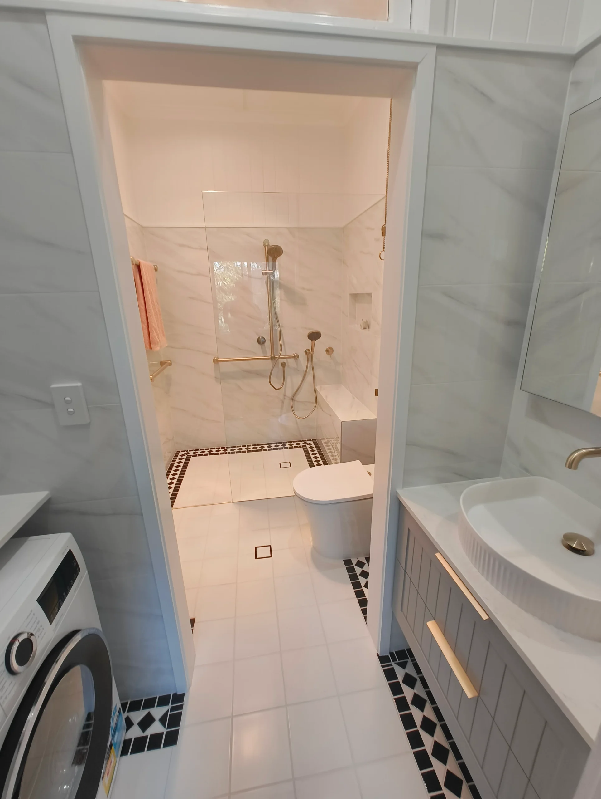 Understanding the owners’ mobility requirements, we removed the existing bathtub and installed a spacious walk-in shower. Specialised grab rails were strategically positioned throughout the shower space to provide essential support and stability. A purpose-built bench seat enables comfortable seated showering when needed.