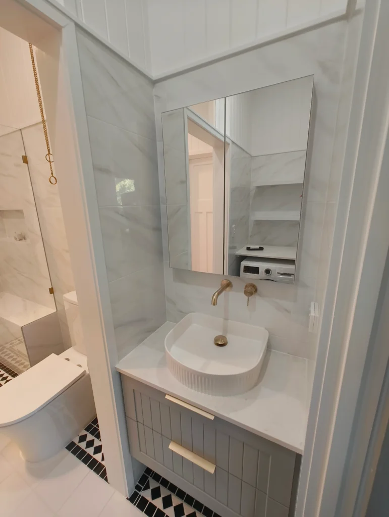 The renovation showcases beautiful Carrara Gloss 300×600 porcelain tiles with a sophisticated marble appearance on the walls. Above shower height, traditional VJ (vertical joint) panelling maintains the home’s period character whilst providing practical water resistance.